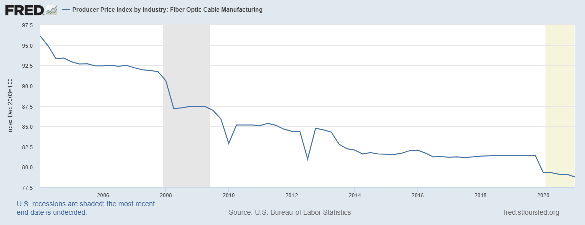Fiber has emerged as another alternative to copper. Historically fiber has been more expensive than copper, but with the rising costs of copper and the decreasing cost of installation of fiber, it is now a much more cost-competitive alternative. The graph below demonstrates the sharp decrease in the Product Price Index (PPI) for the manufacturing of fiber optic cable:
